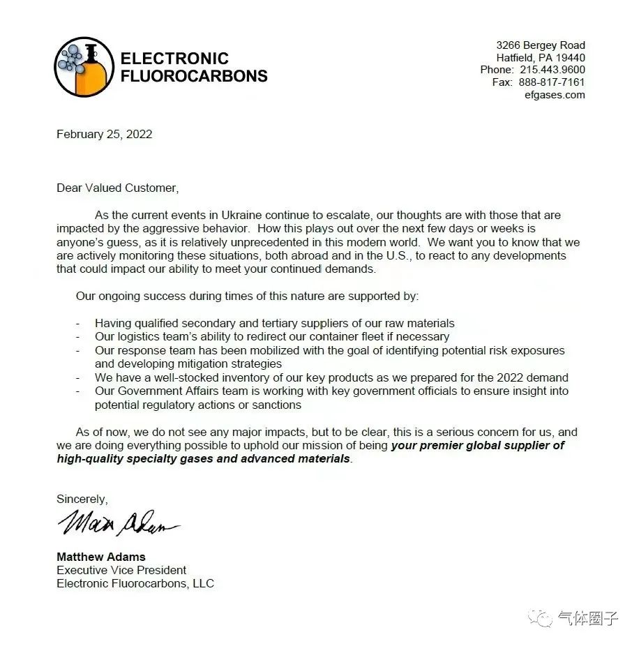 2月26日,美国电子特气公司EFC发布声明:公司已经为2022年准备了充足的全年库存,而且拥有合格的第二和第三材料供应商。